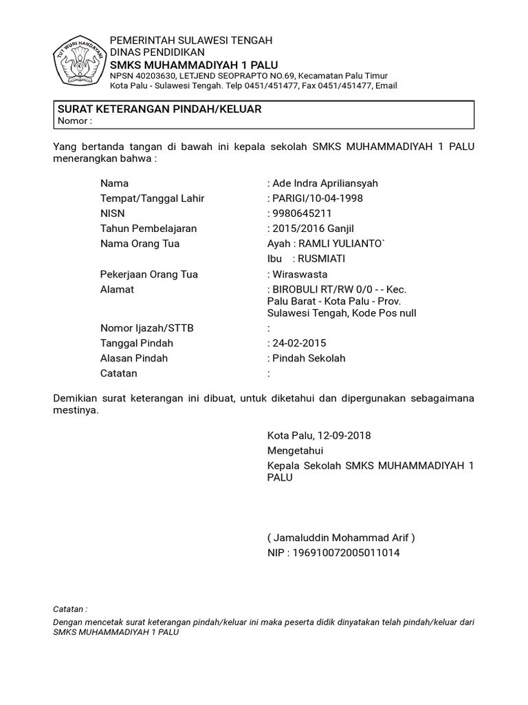 Contoh surat keterangan pindah induk guru : Pernyataan tertulis dari kepala sekolah ini bisa untuk guru ataupun siswa tentunya untuk suatu keperluan dari objek yang dinyatakan. Contoh surat keterangan pindah sekolah siswa sd/smp/sma dan sederajat minggu, 25 juli 2021 contoh surat keterangan pindah sekolah bagi siswa berisi nama siswa, no induk, nama sekolah, kelas dan semester yang ditinggalkan, contoh surat keterangan pindah sekolah siswa, tanda tangan kepala sekolah, stempel sekolah dan tanda tangan orang tua siswa. Contoh surat mutasi guru swasta, pns, honorer atau surat pindah tugas guru smp, sma, smk, smp terbaru beserta syarat mutasi guru terbaru. Surat keterangan pindah sekolah merupakan jenis surat resmi yang secara resmi dikeluarkan/dibuat oleh pihak sekolah tertentu, isi dari sutar tersebut menerangkan bahwa siswa.